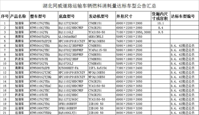 湖北同威道路運輸車輛燃料消耗量達標(biāo)車型公告匯總