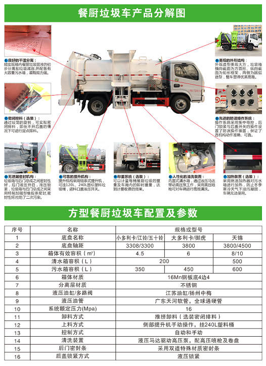1、該車用于餐廚垃圾收集清運,主要專用裝置為垃圾桶升降裝置,封閉式垃圾罐等裝置。該車僅選用2800mm和3300mm軸距底盤,外形長度/軸距對應(yīng)關(guān)系為(mm):5185/2800,5685/3300。2.側(cè)/后防護(hù)材料為Q235,側(cè)防護(hù)螺栓連接,后防護(hù)焊接,截面尺寸100×50mm,下邊緣離地高400mm。3.ABS生產(chǎn)廠家/型號:威伯科汽車控制系統(tǒng)(中國)有限公司/ABS-E 4S/4M;浙江萬安科技股份有限公司/VIE ABS-II;廣州瑞立科密汽車電子股份有限公司/CM4XL-4S/4M;蕪湖伯特利汽車安全系統(tǒng)有限公司/WBTL-ABS。隨底盤選裝駕駛室。 |