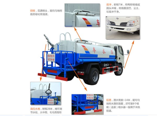 灑水車(chē)又稱(chēng)園林綠化噴灑車(chē)、水罐車(chē)、農(nóng)藥噴灑車(chē)、多功能灑水車(chē)等,主要適合于各種路面沖洗,樹(shù)木、綠化帶、草坪綠化,道路、廠礦企業(yè)施工建設(shè),高空建筑沖洗。具有灑水、壓塵、高、低位噴灑,農(nóng)藥噴灑、護(hù)欄沖洗等功能。 |