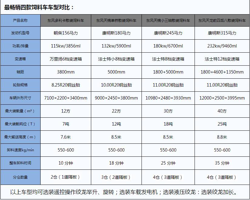 | 其它資料:采用東風(fēng)原裝底盤,康明斯180/210馬力,法士特小8擋變速箱,5000mm軸距,10.00R20鋼絲胎,電動(dòng)門窗,中控鎖,ABS,方向助力,空調(diào),環(huán)保+燃油,罐體材質(zhì)采用4mm優(yōu)質(zhì)碳鋼板,整車3條絞龍,由3個(gè)5.5KW電機(jī)帶動(dòng),頂部絞龍用液壓控制舉升,可左右旋轉(zhuǎn)180°,罐體可做叁個(gè)獨(dú)立分倉,可以獨(dú)立控制各分倉卸料順序和速度,卸料管傾斜60度,垂直卸料高度8.5米, 大裝載12噸,整車卸料完用時(shí)約18分鐘。 |