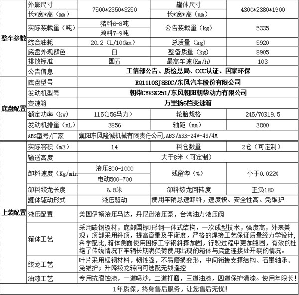 | 罐體外形尺寸:4800×2300×1850(mm);罐體有效容積:11.2立方米;隨底盤選裝駕駛室.1.防護(hù)材料:Q235,連接方式:側(cè)/后防護(hù)材料為Q235,均為焊接連接;后防護(hù)截面尺寸230×60mm,下邊緣離地高450mm;2.后伸量:200mm;3.采用CY4SK251,ISF3.8s5154,YC4S150-50,4DX23-140E5,YN38CRE1發(fā)動(dòng)機(jī),油耗值分別為(L/100km):23.6,24.0,24.2,24.8,24.7;4.ABS系統(tǒng)生產(chǎn)廠家,型號(hào) :襄陽(yáng)東風(fēng)隆誠(chéng)機(jī)械有限責(zé)任公司,ABS/ASR-24V-4S/4M;5.該車專用裝置為絞龍,用于運(yùn)輸散裝飼料.選裝電動(dòng)輸料系統(tǒng)結(jié)構(gòu). |