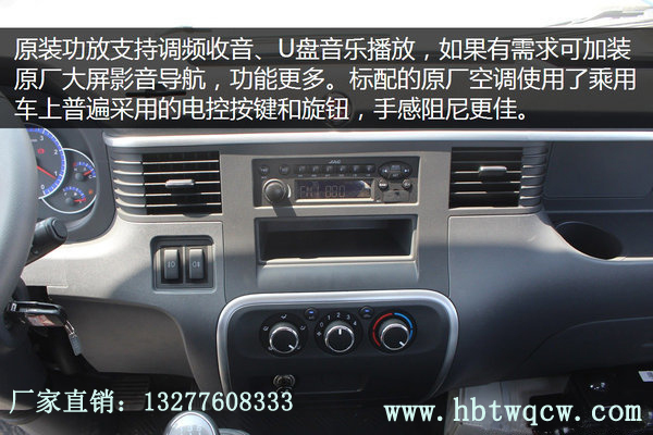 江淮駿鈴V5底盤型號HFC1045P92K2C2ZV,1900mm豪華寬體駕駛室,軸距3308mm,江淮五十鈴HFC4DA1-2D發(fā)動機(jī)120馬力,7.00R16LT 8PR鋼絲胎,ABS,電動門窗,中控鎖,原廠空調(diào),多功能方向盤,LED大燈。